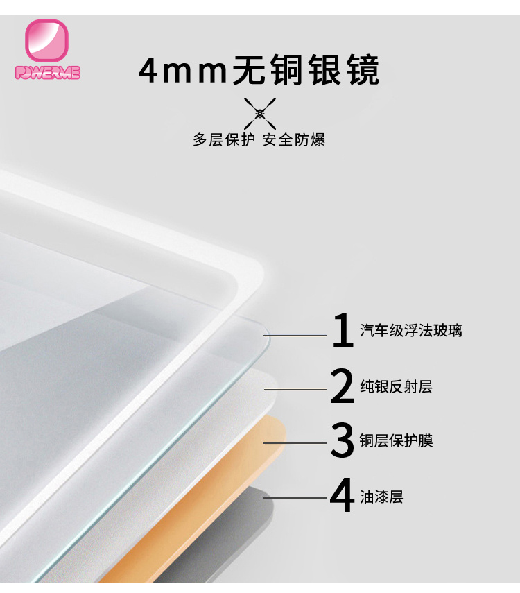 2.環保無銅鏡面,浮化玻璃,帶有拋光邊緣保護手指,4毫米厚度,適用于高濕度位置使用